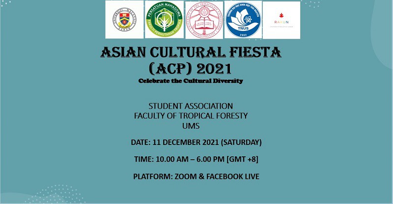 Chương trình Giao lưu văn hóa quốc tế Asian Cultural Fiesta được tổ chức bởi Khoa Lâm nghiệp nhiệt đới – Trường Đại học Sabah (UMS - Malaysia) sẽ diễn ra từ 9h00 – 17h00 (theo giờ Malaysia), ngày 11/12/2021. Do những diễn biến phức tạp của dịch COVID-19, sự kiện lần này sẽ được thực hiện bằng hình thức trực tuyến, qua nền tảng Webex.