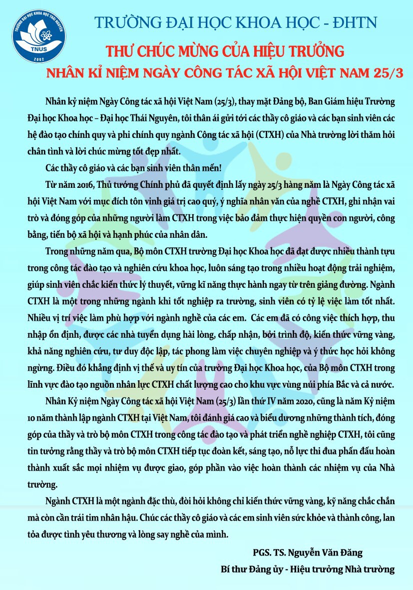 Thư chúc mừng của Hiệu trưởng nhân kỷ niệm ngày Công tác xã hội Việt Nam 25/3