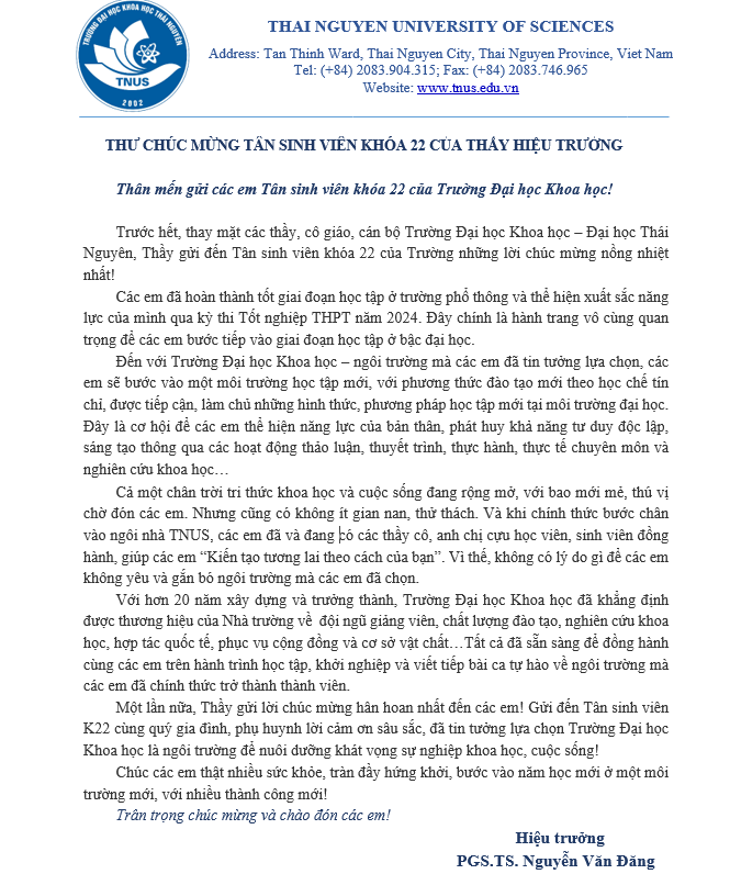 THƯ GỬI CÁC EM TÂN SINH VIÊN KHÓA 22 TRƯỜNG ĐẠI HỌC KHOA HỌC