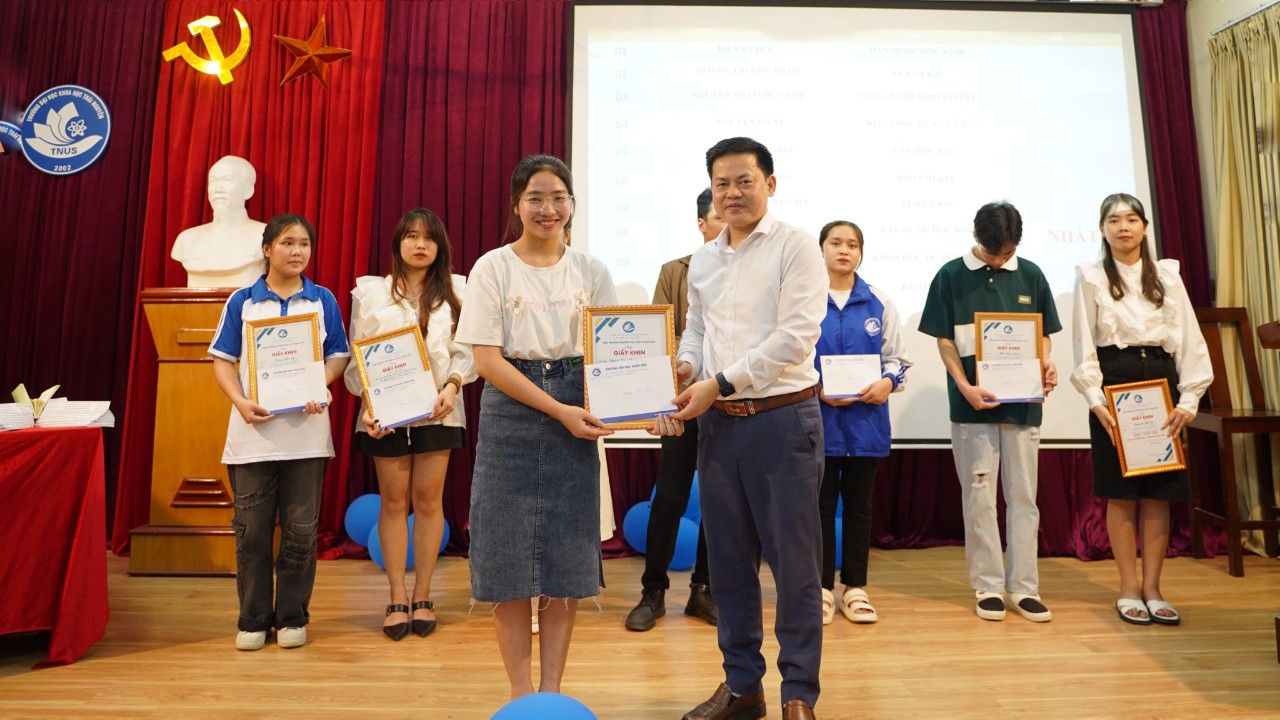 ThS. Nguyễn Đình Huy, Giám Đốc Trung tâm Ngoại ngữ- Tin học, trao giải cho các Sinh viên đạt giải thưởng của cuộc thi