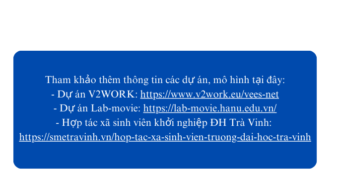 Hội thảo chia sẻ kết quả thực hiện dự án "Tăng cường năng lực hệ thống giáo dục đại học Việt Nam nhằm hỗ trợ khả năng tìm kiếm việc làm của sinh viên sau tốt nghiệp và phát triển kỹ năng khởi nghiệp” - V2WORK; Dự án “Khảo sát nhu cầu của doanh nghiệp tại các trường đại học của Việt Nam - Lab – Movie”. Bên cạnh đó, các diễn giả chia sẻ kinh nghiệm thực hiện các hoạt động về khởi nghiệp và đổi mới sáng tạo tại các trường đại học Việt Nam. Các tham luận được trình bày trong hội thảo xoay quanh các vấn đề: xây dựng mô hình Hợp tác xã khởi nghiệp cho sinh viên, thúc đẩy việc đào tạo các học phần về khởi nghiệp nhằm trang bị các kiến thức, kỹ năng, thúc đẩy tinh thần giúp sinh viên khởi nghiệp ngay trên ghế nhà trường, thích ứng dần với môi trường lập thân, lập nghiệp.