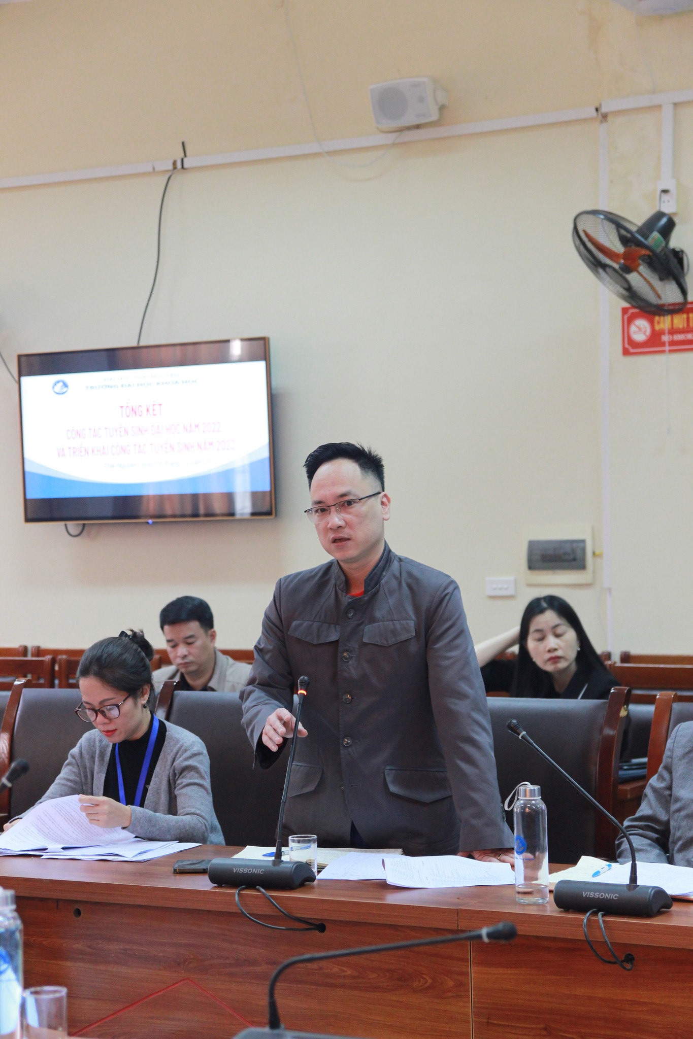 Tại hội nghị, TS. Trần Xuân Quý – Phó Giám đốc Trung tâm Truyền thông, Đối ngoại và Tuyển sinh thay mặt cho các đơn vị phụ trách công tác tuyển sinh trình bày dự thảo Báo cáo tổng kết công tác tuyển sinh năm 2022, phương hướng, kế hoạch công tác tuyển sinh năm 2023 đối với hệ Đại học chính quy. Trong đó, báo cáo chỉ rõ: trong bối cảnh có nhiều thách thức, áp lực cạnh tranh giữa các cơ sở giáo dục đại học ngày càng lớn, công tác tư vấn tuyển sinh năm 2022 của Nhà trường đã có sự chuẩn bị chu đáo, chủ động và linh hoạt, Tư vấn, vận động tuyển sinh trực tiếp tại các trường THPT, TTGDTX…. tích cực dụng công nghệ thông tin, tích cực sử dụng các kênh truyền thông truyền thông và tư vấn đa dạng, đặc biệt là có sự đồng lòng nỗ lực của tập thể cán bộ giảng viên Nhà trường trong tất cả các khâu của quá trình tuyển sinh. Vì vậy, công tác tuyển sinh năm 2022 đã đạt được những kết quả nhất định về số lượng, chất lượng ở tất cả các bậc, hệ đào tạo.