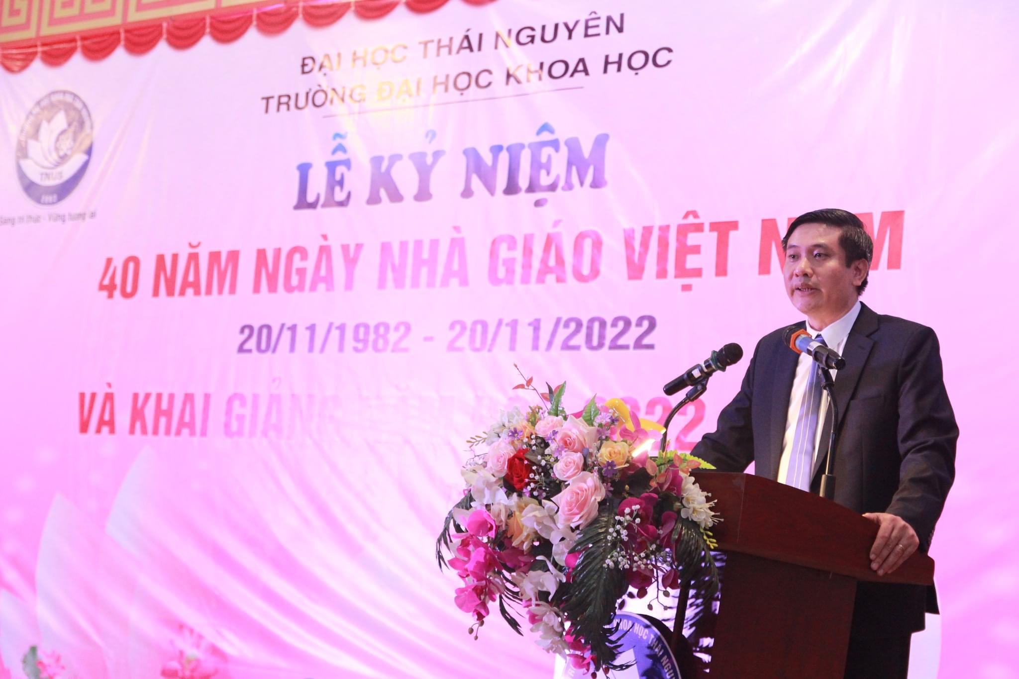 Phát biểu khai mạc chương trình, PGS.TS. Nguyễn Văn Đăng – Bí thư Đảng ủy, Hiệu trưởng Nhà trường đã thay mặt Đảng ủy, Ban Giám hiệu gửi tới các thế hệ nhà giáo, CBVCNLĐ, giảng viên thỉnh giảng lời chúc mừng và cảm ơn, tri ân sâu sắc nhân dịp kỷ niệm 40 năm Ngày nhà giáo Việt Nam 20/11. Đồng thời, thầy Hiệu trưởng Nguyễn Văn Đăng cũng đã tổng kết lại những kết quả đã đạt được trong năm học 2021 – 2022: Công tác Tuyển sinh năm học qua khá thành công và có nhiều khởi sắc với những con số ấn tượng như: Quy mô đào tạo toàn trường giữ vững trên 6.500 người học; Tuyển sinh ĐHCQ năm 2022ghi nhận số học sinh được tuyển thẳng cao nhất từ trước tới nay; Tỉ lệ đầu vào đạt điểm trên 20 là 89%. Các ngành Khoa học cơ bản đang có dấu hiệu phục hồi… Công tác Nghiên cứu khoa học cũng có nhiều thành tích nổi bật với: Số lượng công bố quốc tế được duy trì ổn định, khoảng 100 bài báo quốc tế thuộc các danh mục ISI/Scopus; Số lượng đề tài cấp Nhà nước, cấp Bộ, cấp Tỉnh tiếp tục ổn định…Công tác đào tạo, phát triển đội ngũ cán bộ, giảng viên vẫn được chú trọng. Tính đến năm học vừa qua, đội ngũ giảng viên có trình độ từ TS trở lên đạt 50% đứng thứ 3 trong Đại học Thái Nguyên; Tính đến năm học 2021 – 2022 đã có 14 nhà giáo được công nhận đạt chuẩn chức danh PGS… Công tác quản trị đại học, chuyển đổi số được phát triển mạnh mẽ; hệ thống đại học điện tử được hoàn thiện và đưa vào áp dụng toàn diện các hoạt động. Các hoạt động liên quan đến người học như xây dựng cơ sở vật chất, nâng cao ý thức tự giác, tự quản của sinh viên, quan tâm và lắng nghe phản ánh, tâm tư, nguyện vọng của các bạn sinh viên được quan tâm đúng mức…. Đặc biệt, Nhà trường đã tổ chức thành công các sự kiện chào mừng Kỷ niệm 20 năm ngày thành lập Trường… Với những kết quả đạt được của năm học qua,thầy Hiệu trưởng đã nhiệt liệt biểu dương và ghi nhận những đóng góp, tâm huyết của CBVC NLĐ và người học trong toàn Trường và đưa ra những nhiệm vụ trọng tâm trong năm học 2022 -2023 với chủ đề: Đoàn kết – Kỷ cương – Sáng tạo – Chất lượng.