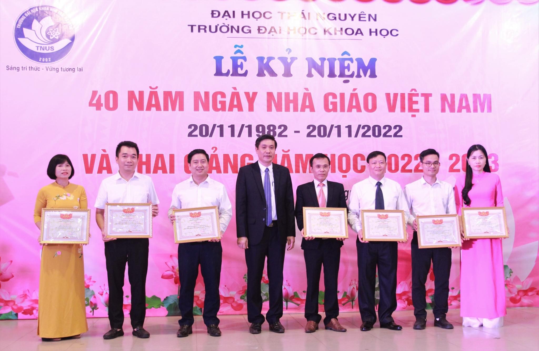 Cũng tại buổi Lễ, Nhà trường đã tổ chức khen thưởng, vinh danh nhiều cá nhân, tập thể có thành tích xuất sắc trong năm học vừa qua. Trong đó, có 04 cá nhân được nhận Kỷ niệm chương Vì sự nghiệp giáo dục; 04 cá nhân được nhận danh hiệu Chiến sỹ thi đua cấp Bộ; 04 tập thểvà 29 cá nhân được nhận Bằng khen của Bộ trưởng Bộ Giáo dục và Đào tạo năm học 2021 - 2022; 01 Bằng khen của Bộ trưởng Bộ GD&ĐT cho tập thể Trường Đại học Khoa học và 15 cá nhân nhân kỷ niệm 20 năm thành lập Trường; 02 tập thể và 33 cá nhân các CBVC NLĐ được nhận Giấy Khen của Giám đốc Đại học Thái Nguyên năm học 2021 – 2022; 05 tập thể và 25 cá nhân được nhận Giấy Khen của Giám đốc Đại học Thái Nguyên nhân kỷ niệm 20 năm thành lập Trường. Nhằm ghi nhận những kết quả đạt được cũng như khuyến khích các bạn sinh viên, các tập thể lớp đã nỗ lực học tập và rèn luyện trong năm học vừa qua, Nhà trường đã khen thưởng 13 tập thể lớp đạt danh hiệu Tập thể Xuất sắc và 50 cá nhân sinh viên đạt danh hiệu Sinh viên Xuất sắc.