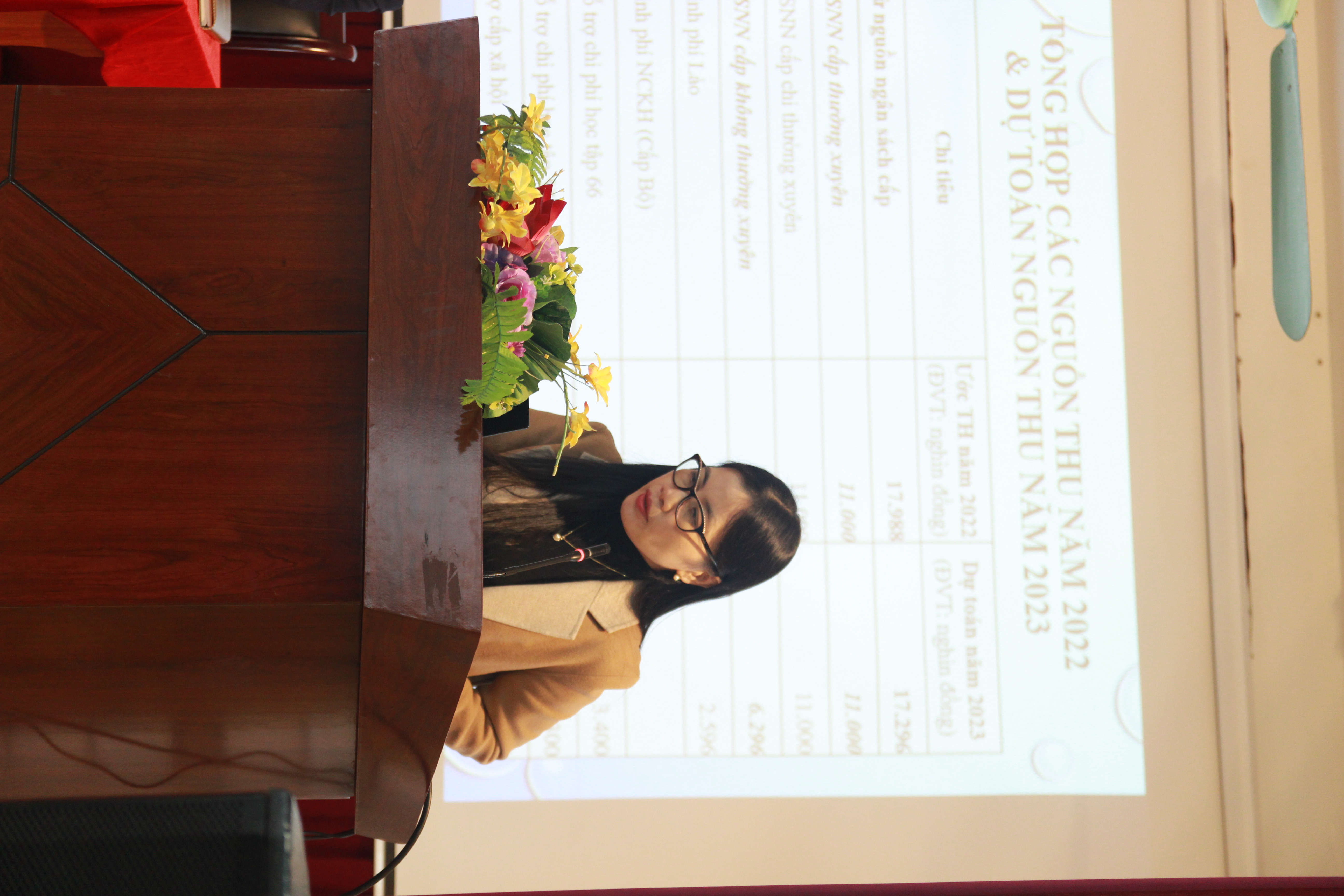 Tại hội nghị, PGS.TS. Phạm Thị Phương Thái đã thay mặt Ban Giám hiệu đánh giá, tổng kết và kiểm điểm trách nhiệm của lãnh đạo trường trong việc thực hiện kế hoạch năm học 2021-2022. Tiếp đó, TS. Nguyễn Thu Hằng – Trưởng phòng Kế hoạch – Tài chính, Kế toán trưởng trình bày Báo cáo thu - chi tài chính năm 2022; Dự toán thu – chi năm 2023 và Dự thảo Quy chế chi tiêu nội bộ năm 2023.