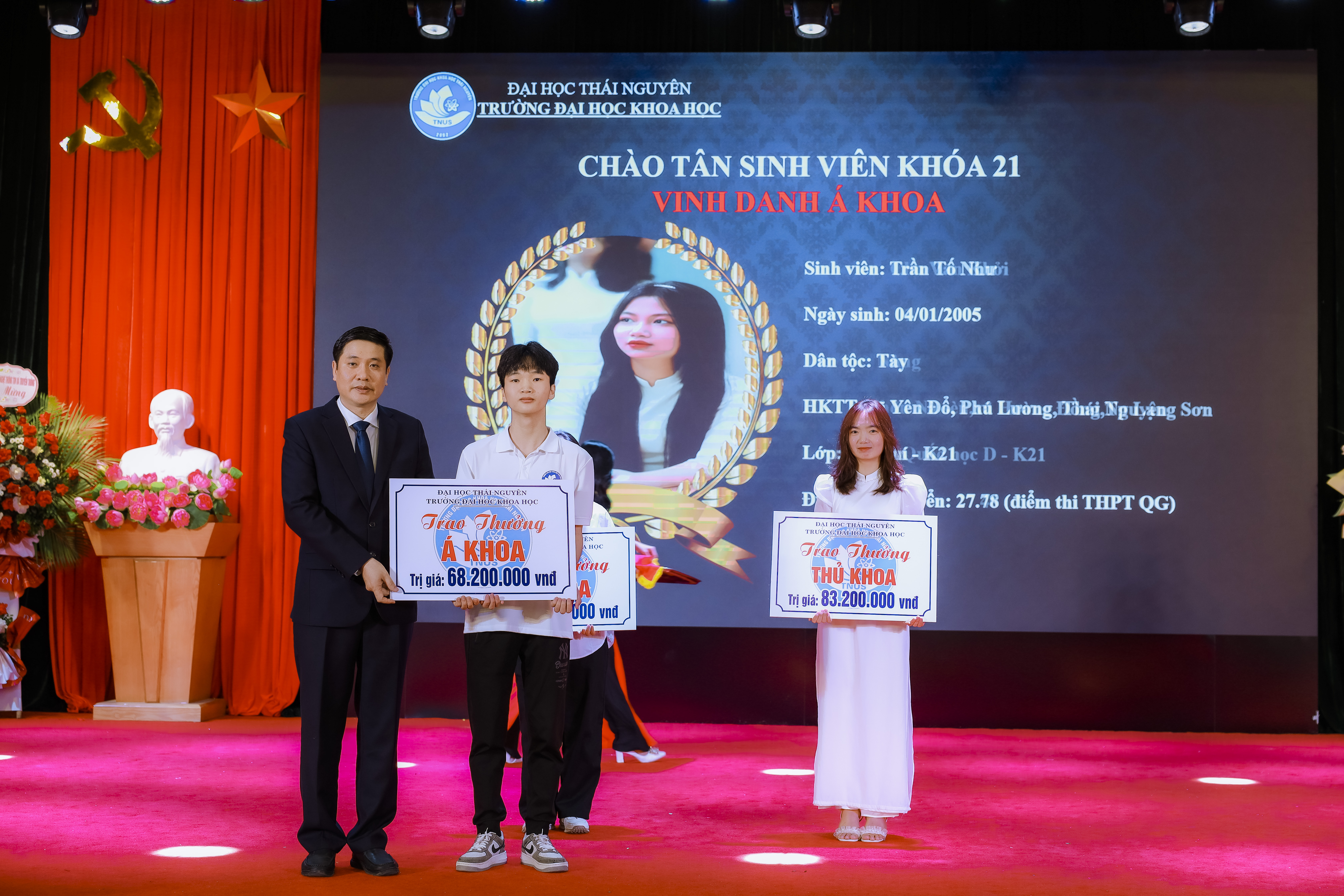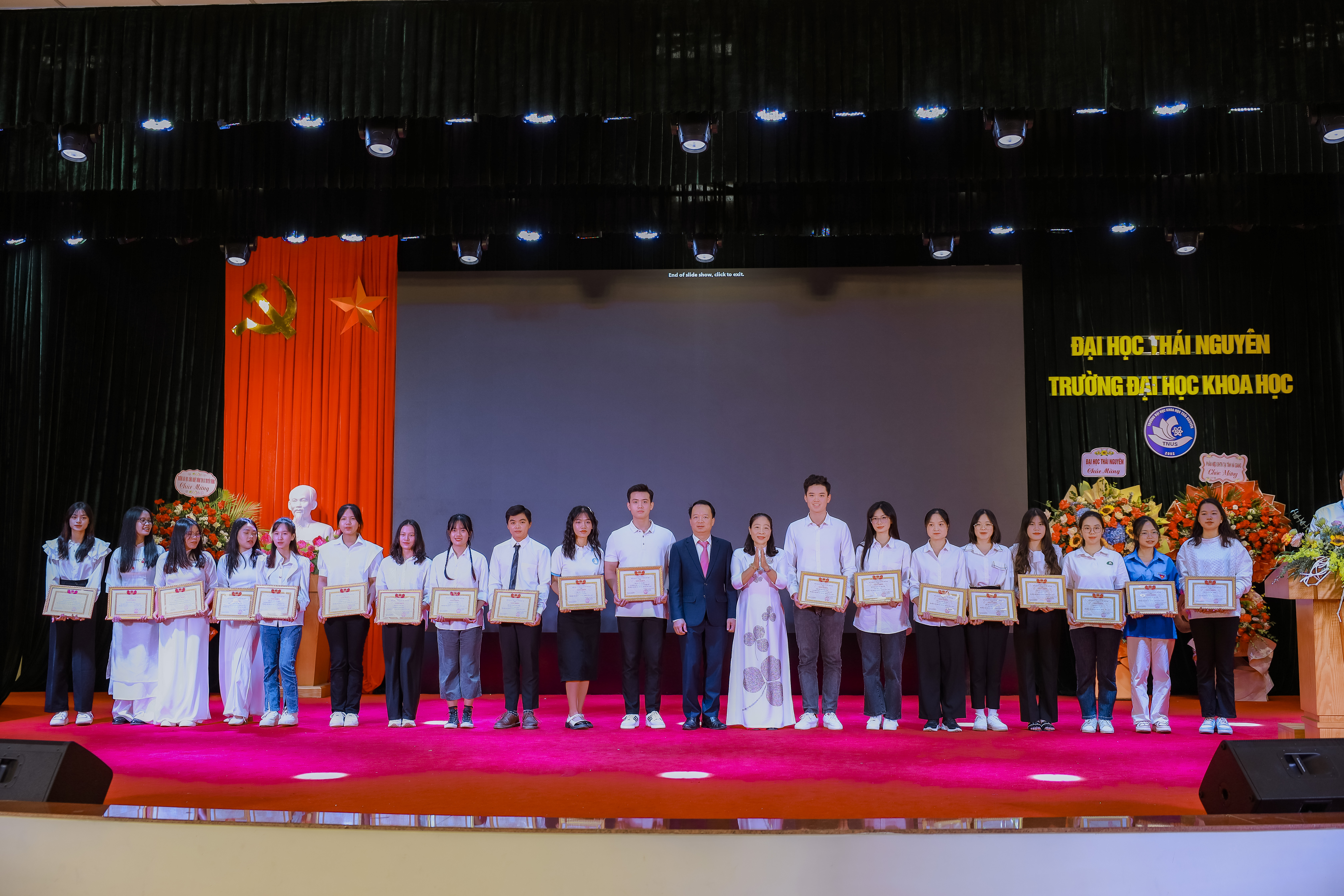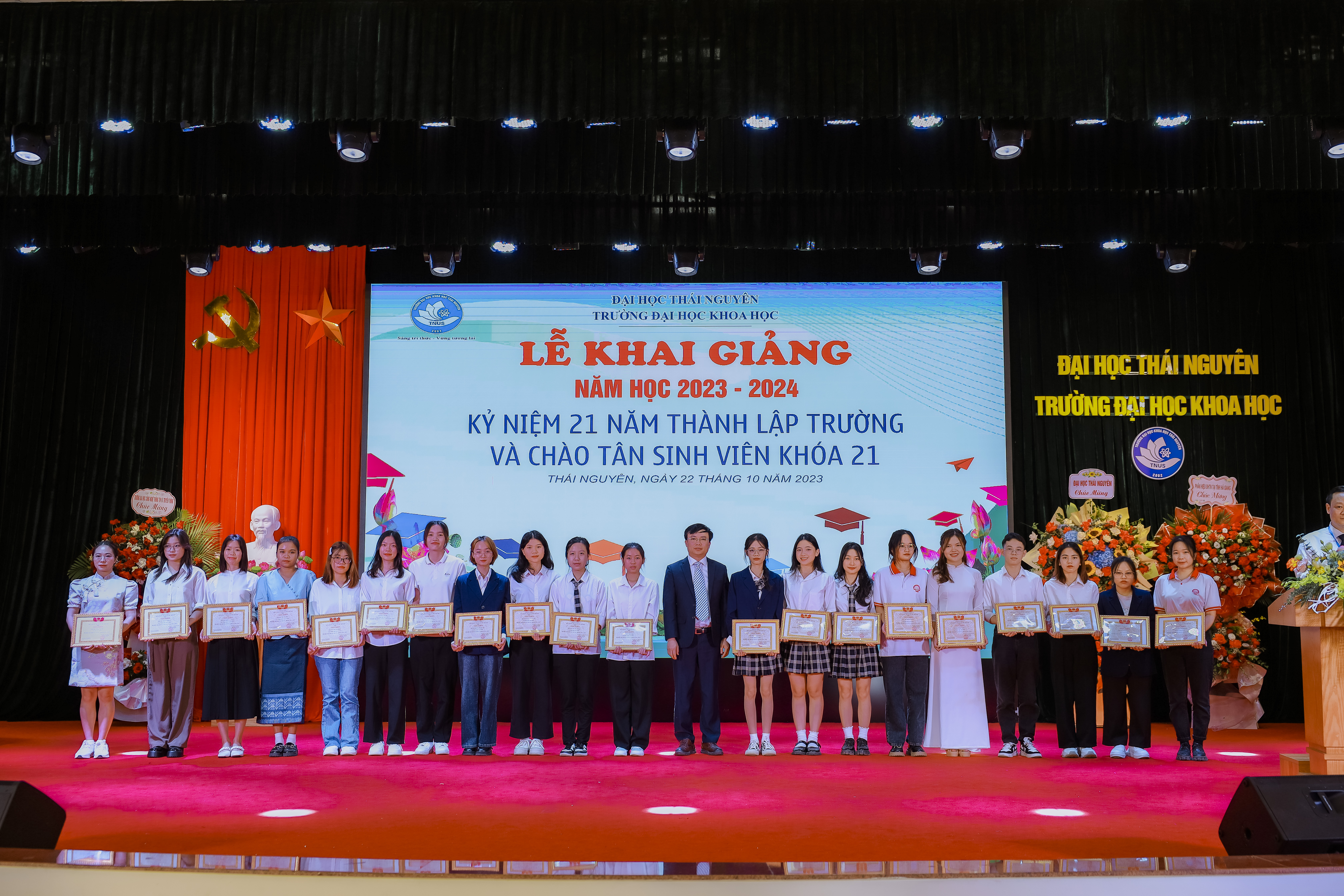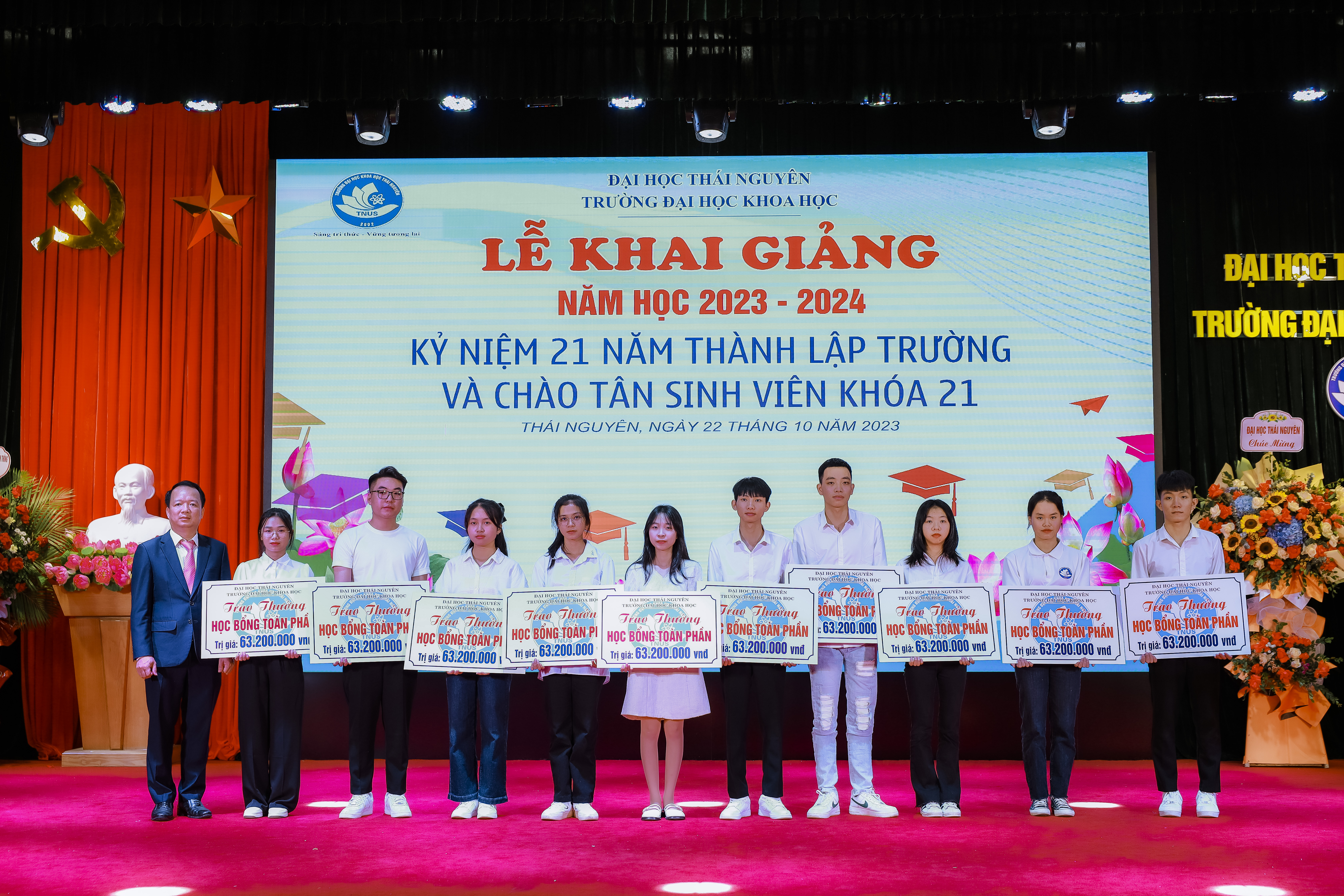 Nhân dịp này, Trường ĐHKH đã công bố và trao học bổng cho Thủ khoa, Á Khoa trong kỳ tuyển sinh năm 2023 đó là các bạn: Lù Thị Huyền Trang (Thủ khoa với số điểm 27,78 học bổng trị giá 83,2 triệu đồng); Trần Tố Như (Á khoa, 27.78, học bổng trị giá 68,2 triệu đồng); Chu Văn Khởi (Á khoa, 27.46, học bổng trị giá 68,2 triệu đồng) (xét điểm thi THPT quốc gia). Nhà trường cũng trao 10 suất học bổng toàn phần loại 1 trị giá 63,2 triệu đồng, 10 suất học bổng toàn phần loại 2 trị giá 33,6 triệu đồng cho Tân sinh viên khoá 21; khen thưởng cho sinh viên có thành tích học tập xuất sắc trong năm học 2022-2023.