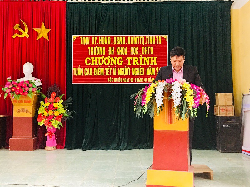 Tại buổi lễ, PGS.TS. Nguyễn Văn Đăng đã phát biểu, chia sẻ và nhấn mạnh: “Phát huy truyền thống tốt đẹp của dân tộc, chung tay hỗ trợ người nghèo vui Xuân đón Tết cổ truyền và hưởng ứng chương trình “Tuần cao điểm Tết vì người nghèo năm 2020”, Đảng ủy, BGH, Công đoàn, Đoàn Thanh niên Trường Đại học Khoa học gửi lời chúc Tết Canh Tý, chúc sức khỏe, thành công và hạnh phúc tới toàn thể bà con nhân dân huyện Định Hoá, đặc biệt là 119 hộ nghèo trong xã Bộc Nhiêu”.