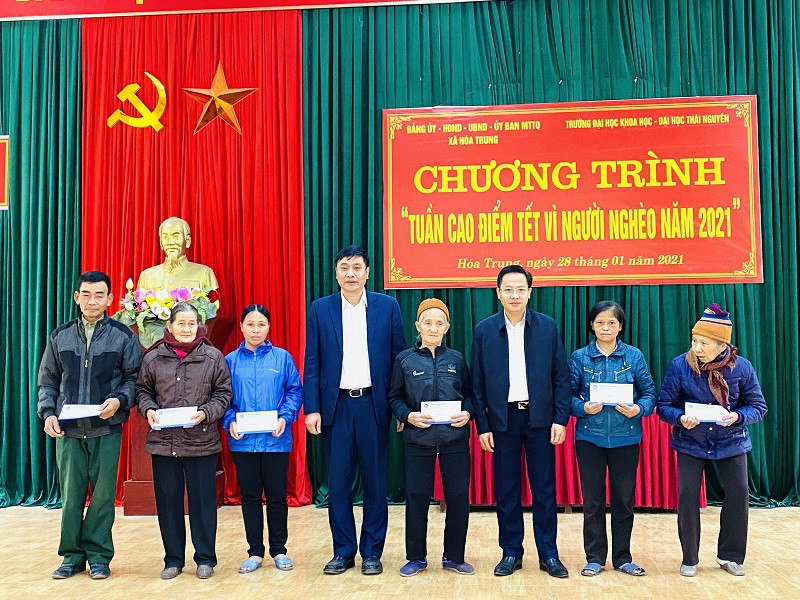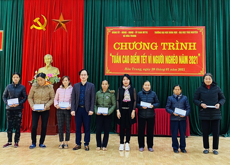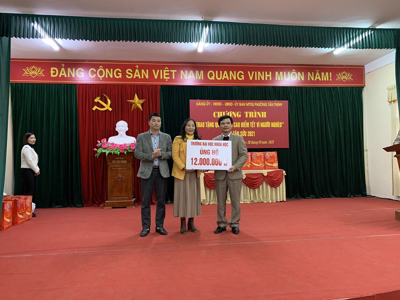 Tết cổ truyền Tân Sửu 2021 đang đến gần, với tinh thần “Cả nước chung tay vì người nghèo - không để ai bị bỏ lại phía sau”; Hưởng ứng “Tuần cao điểm Tết vì người nghèo năm 2021” của Tỉnh ủy Thái Nguyên, ngày 28/01/2021, PGS.TS Nguyễn Văn Đăng - Bí thư Đảng ủy, Hiệu trưởng Nhà trường; PGS.TS Phạm Thị Phương Thái - Phó Hiệu trưởng Nhà trường; Đ/c Nguyễn Trường Sơn - Chủ tịch Công đoàn Trường; Đ/c Ngô Ngọc Linh - Bí thư Đoàn Thanh niên Trường Đại học Khoa học đã đến thăm và trao quà ủng hộ tại huyện Đồng Hỷ và phường Tân Thịnh, tỉnh Thái Nguyên với tổng số tiền 33 triệu đồng.