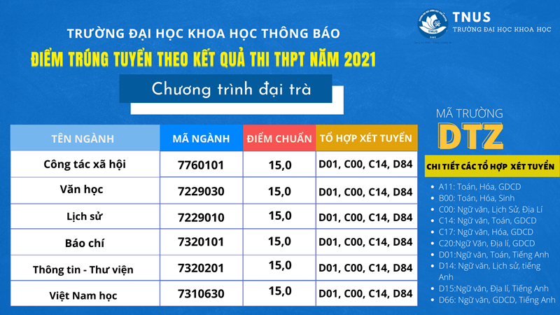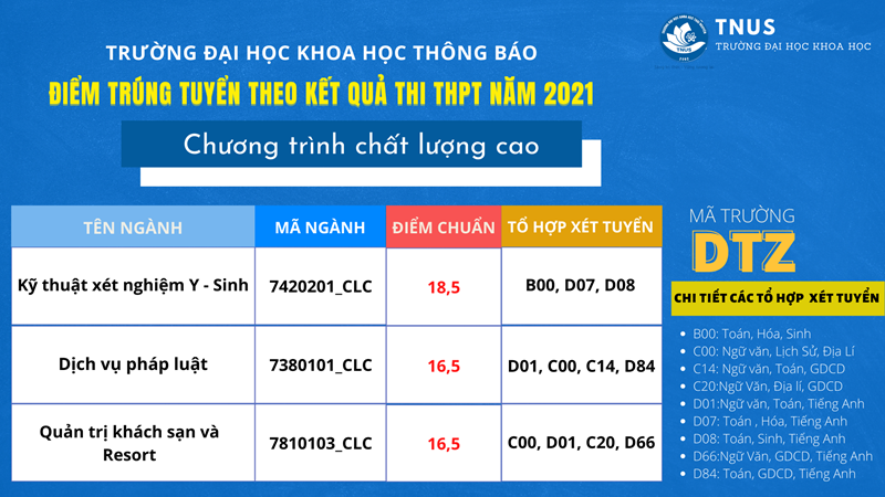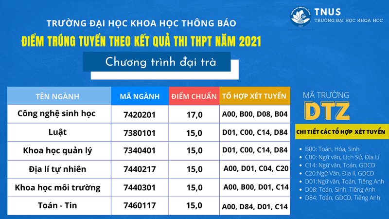 Trường Đại học Khoa học đã chính thức công bố điểm chuẩn các ngành đào tạo ĐH chính quy năm 2021.